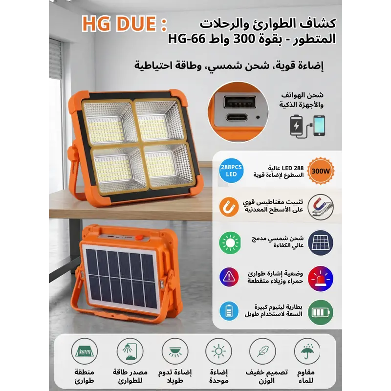 استعد لكل مغامراتك وظروفك الطارئة مع كشاف HG-66 المتطور، الحل الأمثل للإضاءة القوية والمستدامة. يتميز هذا الكشاف بتصميم هجين يجمع بين الإضاءة الفائقة والاعتماد الكلي على الطاقة الشمسية، مما يجعله رفيقك المثالي في التخييم، الرحلات البرية، أو حتى كحل احتياطي عند انقطاع التيار الكهربائي في المنزل.